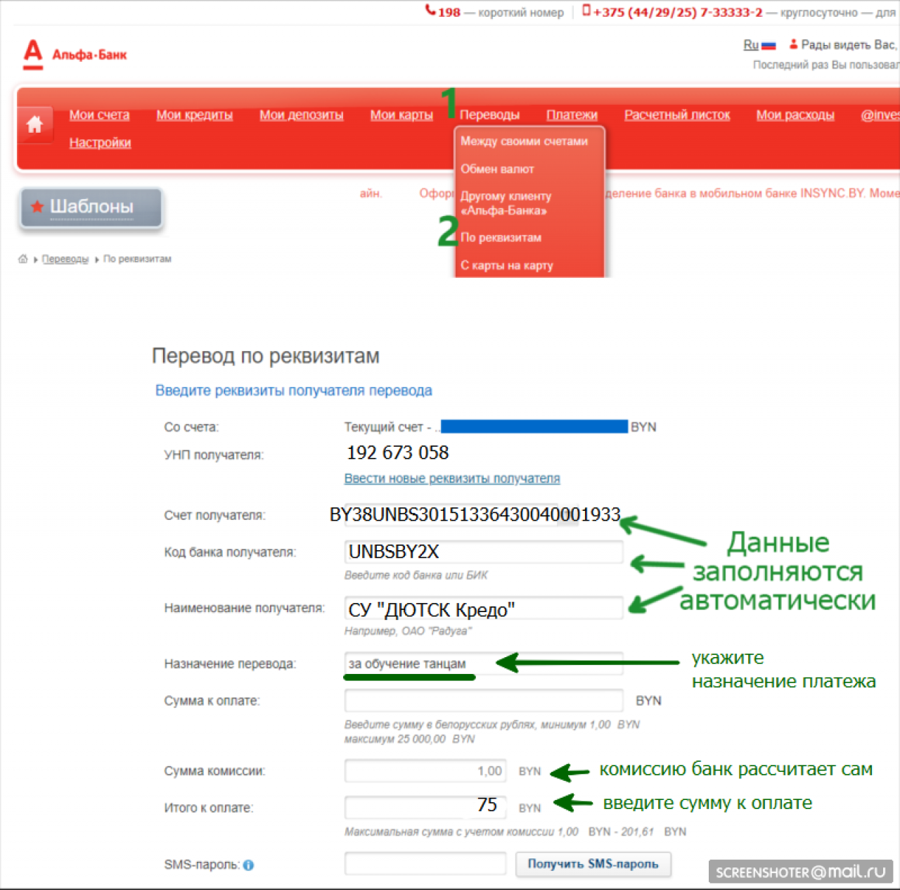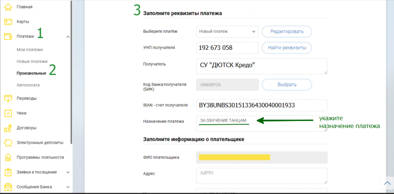- в Интернет-банкинге выберите "произвольный / индивидуальный платеж (не бюджет)" или "Оплата по реквизитам" и укажите наши реквизиты.